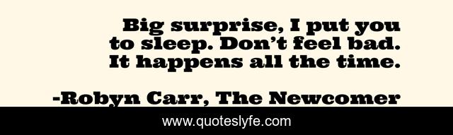 This page presents the quote "Big surprise, I put you to sleep. Don’t feel bad. It happens all the time.". Author of this quote is Robyn Carr, The Newcomer. This quote is about romance, funny, comedy, contemporary-romance, humour,.
