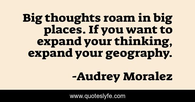 This page presents the quote "Big thoughts roam in big places. If you want to expand your thinking, expand your geography.". Author of this quote is Audrey Moralez. This quote is about thinking, creativity, writing,.