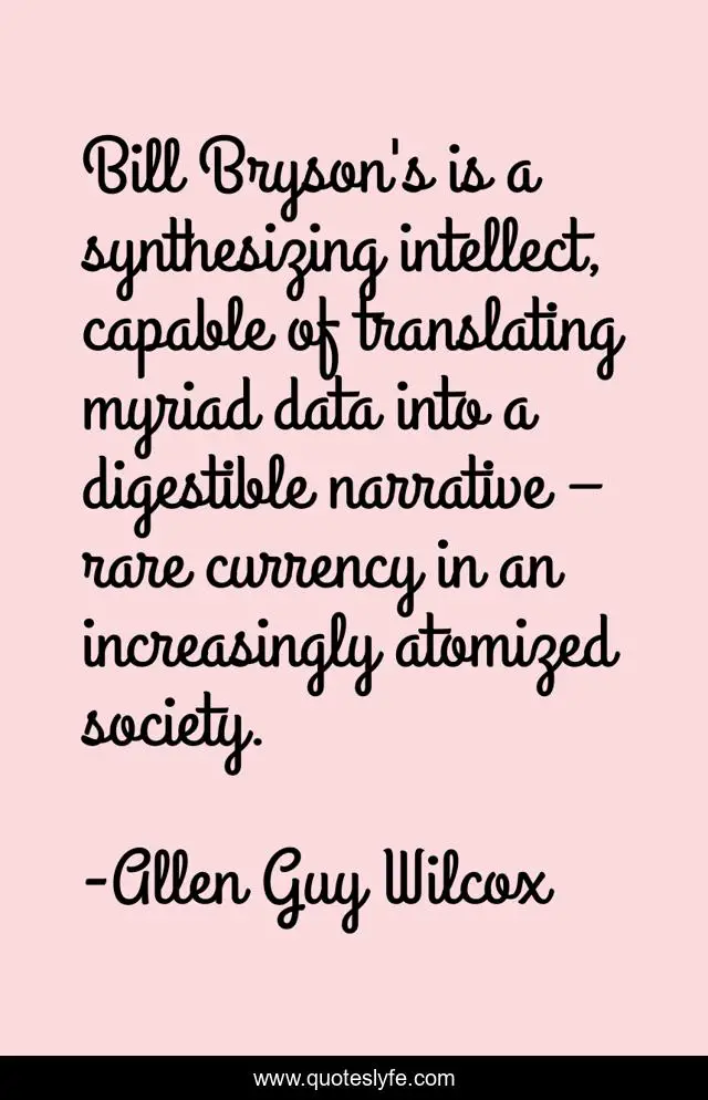 This page presents the quote "Bill Bryson's is a synthesizing intellect, capable of translating myriad data into a digestible narrative – rare currency in an increasingly atomized society.". Author of this quote is Allen Guy Wilcox. This quote is about communication, wisdom, education, instruction, writing,.