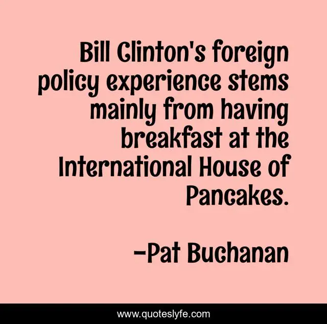 This page presents the quote "Bill Clinton's foreign policy experience stems mainly from having breakfast at the International House of Pancakes.". Author of this quote is Pat Buchanan. This quote is about house, breakfast,.