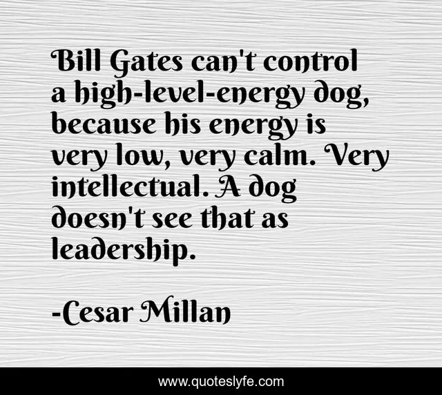 This page presents the quote "Bill Gates can't control a high-level-energy dog, because his energy is very low, very calm. Very intellectual. A dog doesn't see that as leadership.". Author of this quote is Cesar Millan. This quote is about control, dog, calm,.