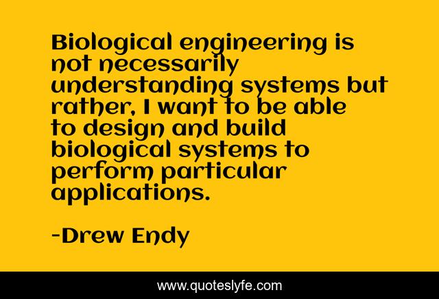 This page presents the quote "Biological engineering is not necessarily understanding systems but rather, I want to be able to design and build biological systems to perform particular applications.". Author of this quote is Drew Endy. This quote is about engineering, understanding,.