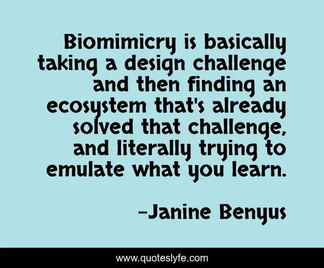 This page presents the quote "Biomimicry is basically taking a design challenge and then finding an ecosystem that's already solved that challenge, and literally trying to emulate what you learn.". Author of this quote is Janine Benyus. This quote is about challenge, learn,.