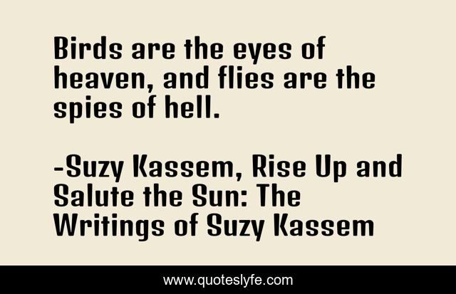 This page presents the quote "Birds are the eyes of heaven, and flies are the spies of hell.". Author of this quote is Suzy Kassem, Rise Up and Salute the Sun: The Writings of Suzy Kassem. This quote is about flies, heaven, eyes, spies, hell, birds,.
