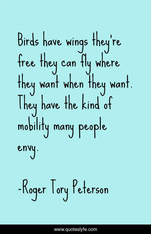 This page presents the quote "Birds have wings they're free they can fly where they want when they want. They have the kind of mobility many people envy.". Author of this quote is Roger Tory Peterson. This quote is about fly, birds, people,.