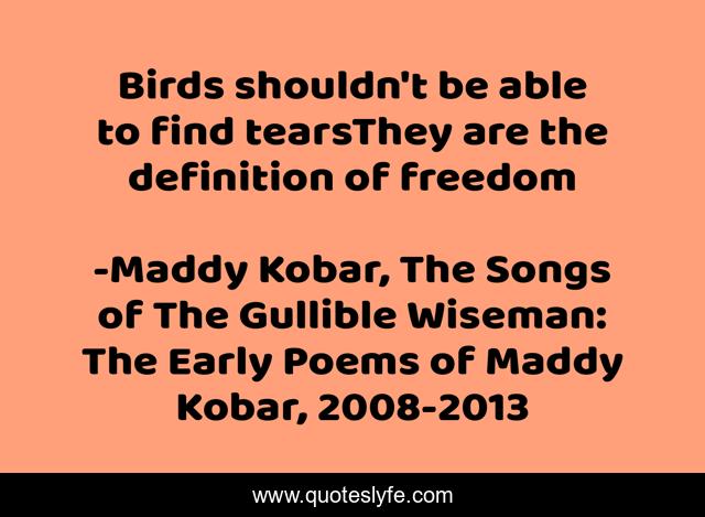 This page presents the quote "Birds shouldn't be able to find tearsThey are the definition of freedom". Author of this quote is Maddy Kobar, The Songs of The Gullible Wiseman: The Early Poems of Maddy Kobar, 2008-2013. This quote is about freedom, sadness, metaphor, poetry,.