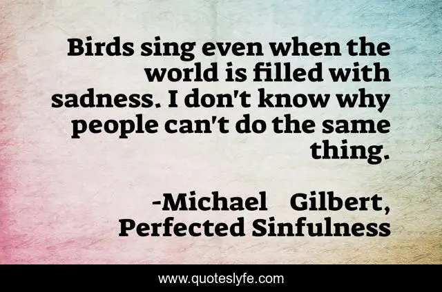 This page presents the quote "Birds sing even when the world is filled with sadness. I don't know why people can't do the same thing.". Author of this quote is Michael Gilbert, Perfected Sinfulness. This quote is about broken-heart, love, breakups, sadness, heartbreak, sadness-love, heartbroken, affection,.