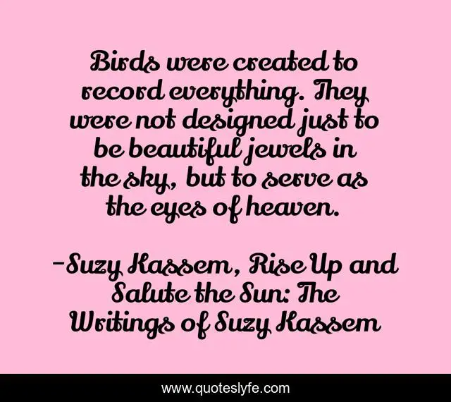 "Suzy Kassem, Rise Up and Salute the Sun: The Writings of Suzy Kassem Quotes." Quoteslyfe.com, 2025. Fri. 05 Dec. 2025. <https://www.quoteslyfe.com/quote/Birds-were-created-to-record-everything-They-11217>.