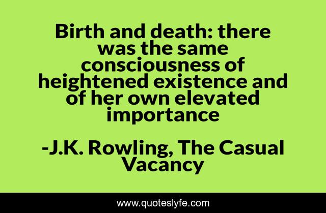This page presents the quote "Birth and death: there was the same consciousness of heightened existence and of her own elevated importance". Author of this quote is J.K. Rowling, The Casual Vacancy. This quote is about death, the-casual-vacancy, birth, j-k-rowling,.