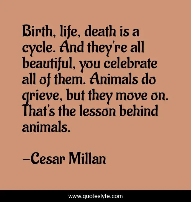 This page presents the quote "Birth, life, death is a cycle. And they're all beautiful, you celebrate all of them. Animals do grieve, but they move on. That's the lesson behind animals.". Author of this quote is Cesar Millan. This quote is about beautiful, life, celebrate,.