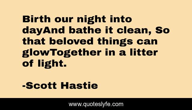This page presents the quote "Birth our night into dayAnd bathe it clean, So that beloved things can glowTogether in a litter of light.". Author of this quote is Scott Hastie. This quote is about spiritual, love, wisdom-inspirational, light, birth, together, wisdom, spirituality, beloved,.