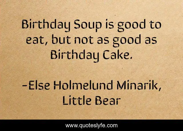 This page presents the quote "Birthday Soup is good to eat, but not as good as Birthday Cake.". Author of this quote is Else Holmelund Minarik, Little Bear. This quote is about cake, food, birthdays, soup,.