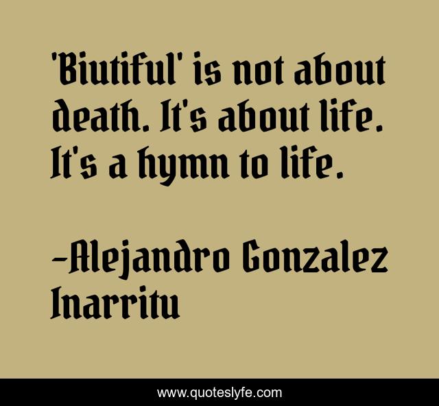 This page presents the quote "'Biutiful' is not about death. It's about life. It's a hymn to life.". Author of this quote is Alejandro Gonzalez Inarritu. This quote is about hymn, life,.