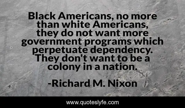 This page presents the quote "Black Americans, no more than white Americans, they do not want more government programs which perpetuate dependency. They don't want to be a colony in a nation.". Author of this quote is Richard M. Nixon. This quote is about black, nation,.