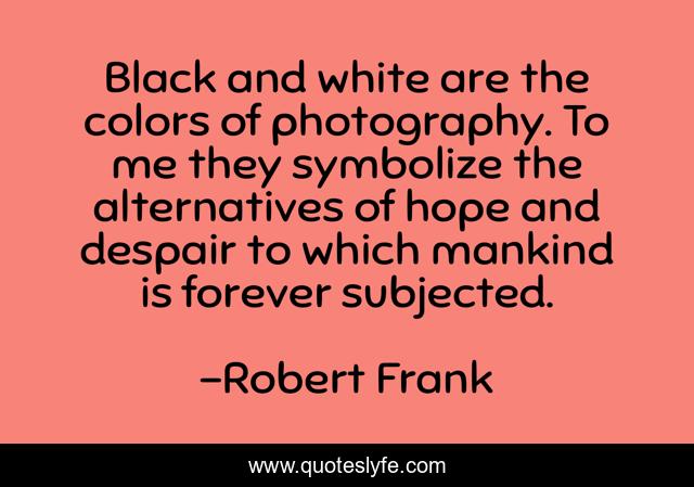 This page presents the quote "Black and white are the colors of photography. To me they symbolize the alternatives of hope and despair to which mankind is forever subjected.". Author of this quote is Robert Frank. This quote is about colors, black and white,.