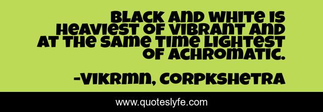 This page presents the quote "Black and white is heaviest of vibrant and at the same time lightest of achromatic.". Author of this quote is Vikrmn, Corpkshetra. This quote is about heavy, black-white, black-and-white, colors, optimistic, vv, confidence, positive, ca-vikram-verma,.
