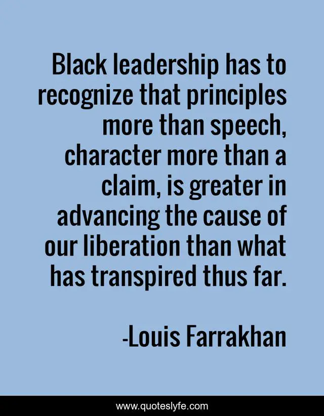 This page presents the quote "Black leadership has to recognize that principles more than speech, character more than a claim, is greater in advancing the cause of our liberation than what has transpired thus far.". Author of this quote is Louis Farrakhan. This quote is about speech, black, character,.