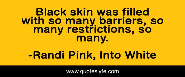 This page presents the quote "Black skin was filled with so many barriers, so many restrictions, so many.". Author of this quote is Randi Pink, Into White. This quote is about diversity, black-women-writers, black-women, own-voices, race, black, poc,.