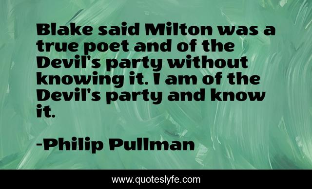 This page presents the quote "Blake said Milton was a true poet and of the Devil's party without knowing it. I am of the Devil's party and know it.". Author of this quote is Philip Pullman. This quote is about john-milton, devil, satan, william-blake, paradise-lost,.