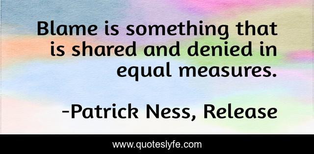 This page presents the quote "Blame is something that is shared and denied in equal measures.". Author of this quote is Patrick Ness, Release. .