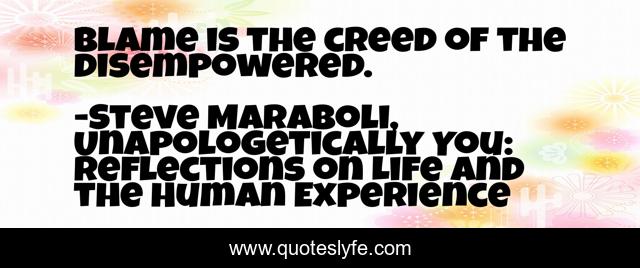 This page presents the quote "Blame is the creed of the disempowered.". Author of this quote is Steve Maraboli, Unapologetically You: Reflections on Life and the Human Experience. This quote is about life, success, positive, creed, motivational, confidence, blame, disempowered, optimistic,.