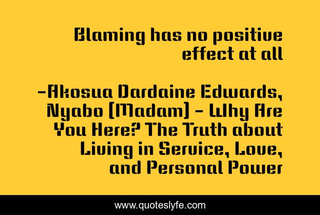 This page presents the quote "Blaming has no positive effect at all". Author of this quote is Akosua Dardaine Edwards, Nyabo (Madam) - Why Are You Here? The Truth about Living in Service, Love, and Personal Power. This quote is about responsibility, why-are-you-here,.
