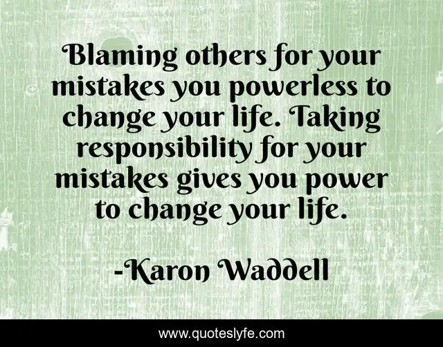 This page presents the quote "Blaming others for your mistakes you powerless to change your life. Taking responsibility for your mistakes gives you power to change your life.". Author of this quote is Karon Waddell. This quote is about confidence, change-your-life, quote-of-the-day, motivational, responsibility-for-your-actions, positive, optimistic, inspirational, quotes-about-life,.