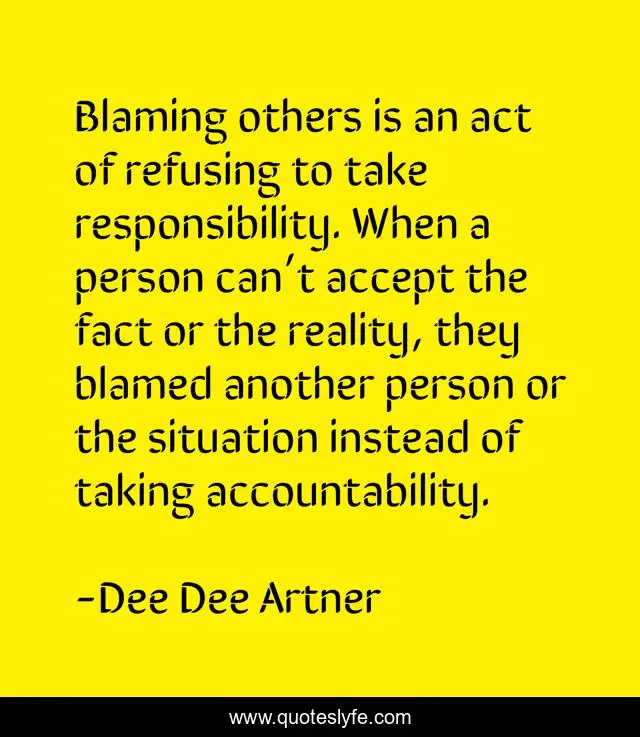 This page presents the quote "Blaming others is an act of refusing to take responsibility. When a person can’t accept the fact or the reality, they blamed another person or the situation instead of taking accountability.". Author of this quote is Dee Dee Artner. This quote is about relationships, productivity, blaming-others, business, people, lifestlye, expectations, millionaire, reality,.
