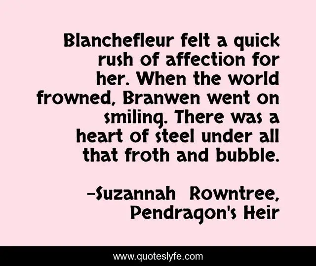 This page presents the quote "Blanchefleur felt a quick rush of affection for her. When the world frowned, Branwen went on smiling. There was a heart of steel under all that froth and bubble.". Author of this quote is Suzannah Rowntree, Pendragon's Heir. This quote is about pendragon-s-heir, suzannah-rowntree, king-arthur, legend, fantasy, mythology, arthurian,.