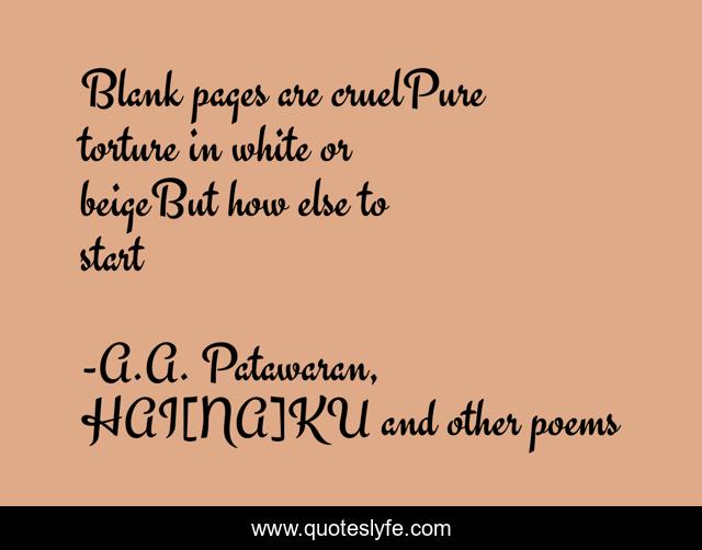 This page presents the quote "Blank pages are cruelPure torture in white or beigeBut how else to start". Author of this quote is A.A. Patawaran, HAI[NA]KU and other poems. This quote is about poem, haiku, poetry, writing,.