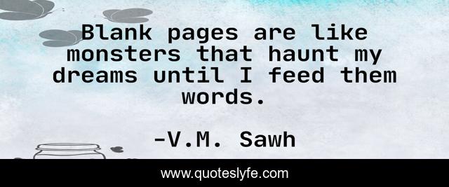 This page presents the quote "Blank pages are like monsters that haunt my dreams until I feed them words.". Author of this quote is V.M. Sawh. This quote is about author, inspiration, monsters, writing,.