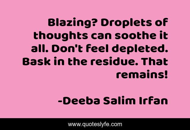 This page presents the quote "Blazing? Droplets of thoughts can soothe it all. Don't feel depleted. Bask in the residue. That remains!". Author of this quote is Deeba Salim Irfan. This quote is about remains, loss, love, affection, love-hurts,.