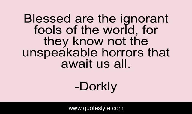 This page presents the quote "Blessed are the ignorant fools of the world, for they know not the unspeakable horrors that await us all.". Author of this quote is Dorkly. This quote is about future, ignorance, knowledge,.