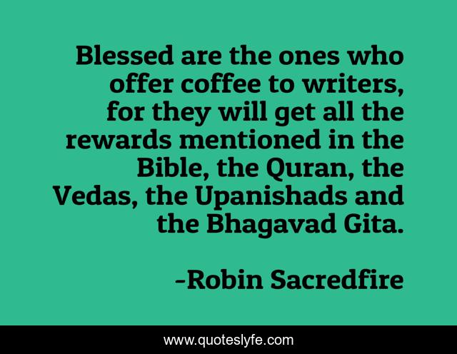 This page presents the quote "Blessed are the ones who offer coffee to writers, for they will get all the rewards mentioned in the Bible, the Quran, the Vedas, the Upanishads and the Bhagavad Gita.". Author of this quote is Robin Sacredfire. This quote is about coffee, writers, authors,.