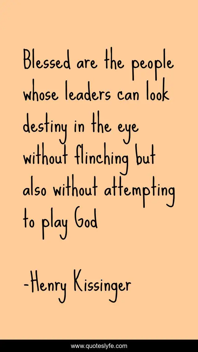 This page presents the quote "Blessed are the people whose leaders can look destiny in the eye without flinching but also without attempting to play God". Author of this quote is Henry Kissinger. .