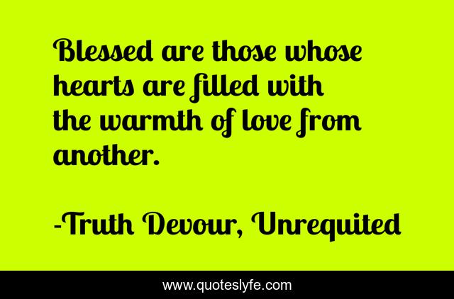 This page presents the quote "Blessed are those whose hearts are filled with the warmth of love from another.". Author of this quote is Truth Devour, Unrequited. This quote is about faith, love, kindred-spirits, joy, blessing, karmic, soul, romance, twin-flames,.