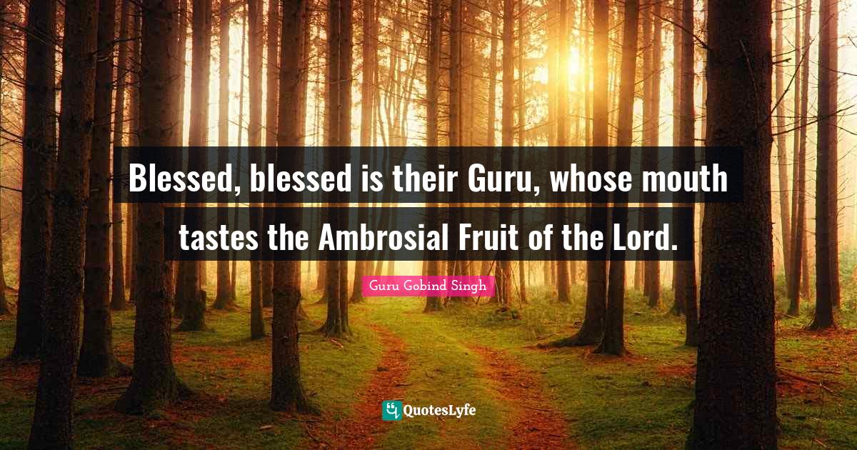 This page presents the quote "Blessed, blessed is their Guru, whose mouth tastes the Ambrosial Fruit of the Lord.". Author of this quote is Guru Gobind Singh. This quote is about guru, taste, lord, blessed, fruit, mouths,.