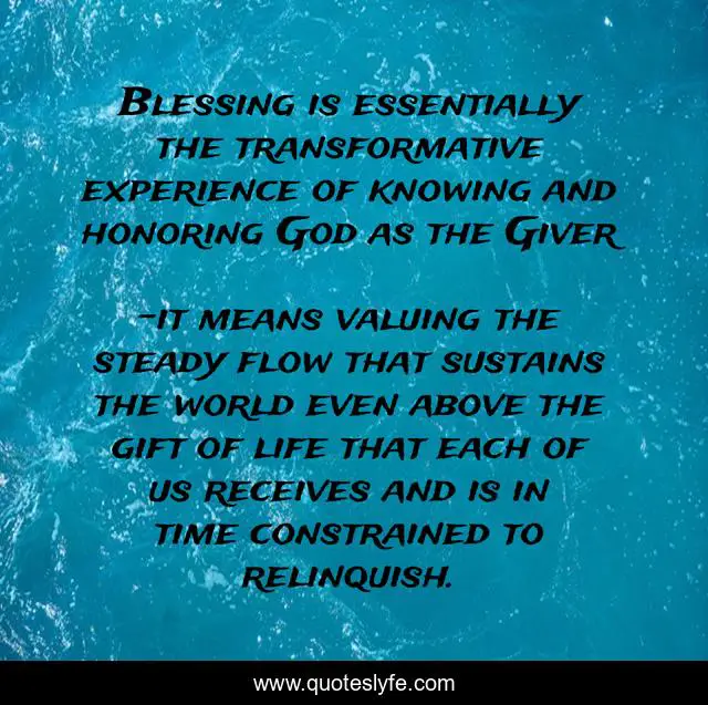 This page presents the quote "Blessing is essentially the transformative experience of knowing and honoring God as the Giver". Author of this quote is it means valuing the steady flow that sustains the world even above the gift of life that each of us receives and is in time constrained to relinquish.. .