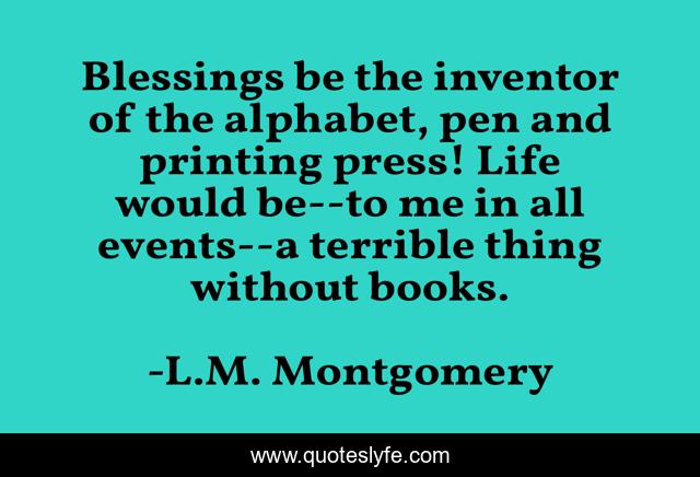 This page presents the quote "Blessings be the inventor of the alphabet, pen and printing press! Life would be--to me in all events--a terrible thing without books.". Author of this quote is L.M. Montgomery. .