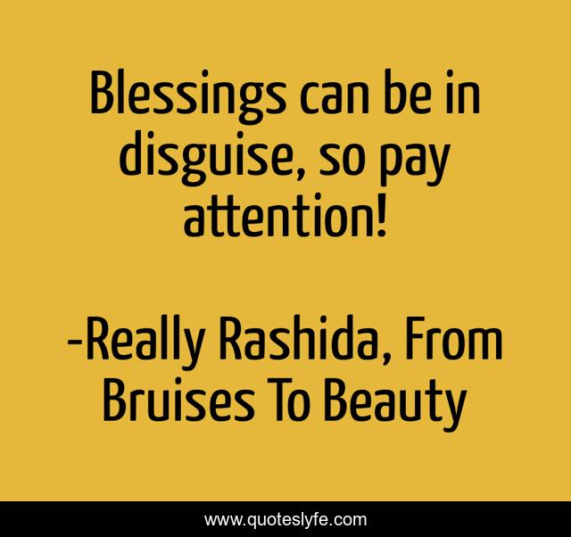 This page presents the quote "Blessings can be in disguise, so pay attention!". Author of this quote is Really Rashida, From Bruises To Beauty. This quote is about inspirational-attitude, enthusiasm, inspirational,.
