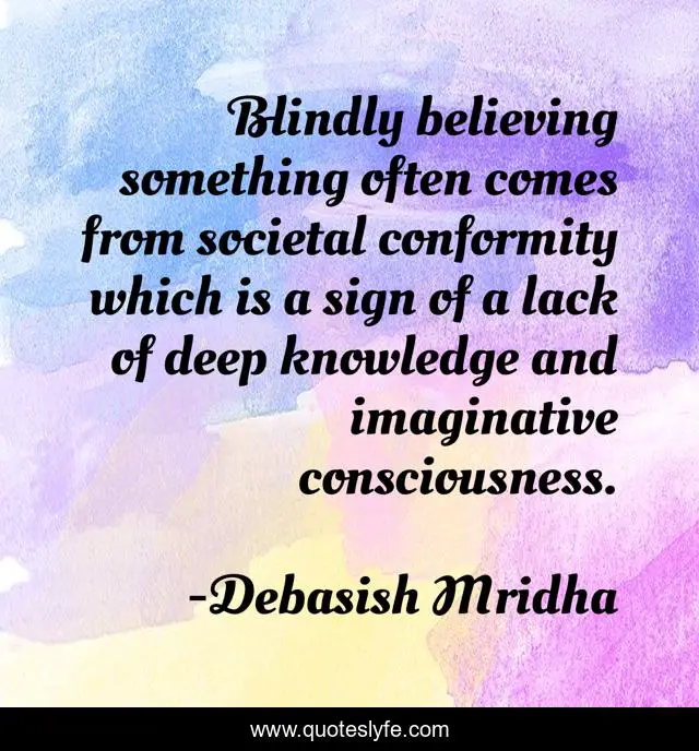 This page presents the quote "Blindly believing something often comes from societal conformity which is a sign of a lack of deep knowledge and imaginative consciousness.". Author of this quote is Debasish Mridha. This quote is about lack-of-knowledge, consciousness, philosophy, debasish-mridha, quotes, inspirational, enthusiasm, conformity, debasish-mridha-m-d,.