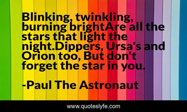 "Paul The Astronaut Quotes." Quoteslyfe.com, 2025. Fri. 05 Dec. 2025. <https://www.quoteslyfe.com/quote/Blinking-twinkling-burning-brightAre-all-the-stars-158268>.