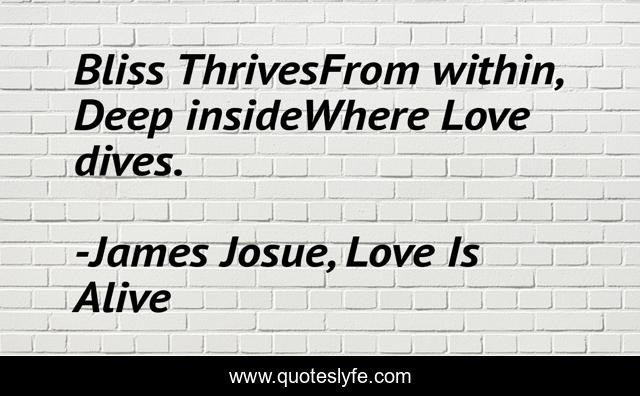 This page presents the quote "Bliss ThrivesFrom within, Deep insideWhere Love dives.". Author of this quote is James Josue, Love Is Alive. This quote is about inspirational-attitude, inspirational-life, love, inspirational-love, affection,.