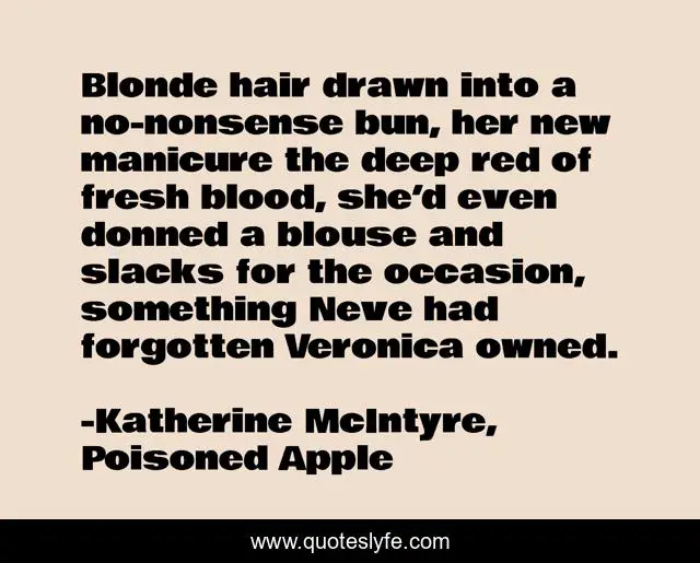 This page presents the quote "Blonde hair drawn into a no-nonsense bun, her new manicure the deep red of fresh blood, she’d even donned a blouse and slacks for the occasion, something Neve had forgotten Veronica owned.". Author of this quote is Katherine McIntyre, Poisoned Apple. This quote is about professional, evil-stepmother, intense, manicure, blood,.