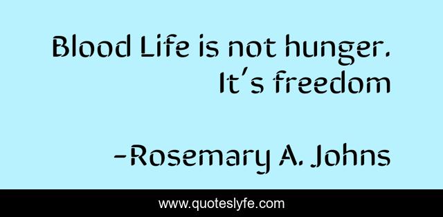 This page presents the quote "Blood Life is not hunger. It’s freedom". Author of this quote is Rosemary A. Johns. This quote is about fantasy-romance, humor, vampires, fantasy, urban-fantasy, vampire, paranormal-romance, romance, quotes,.
