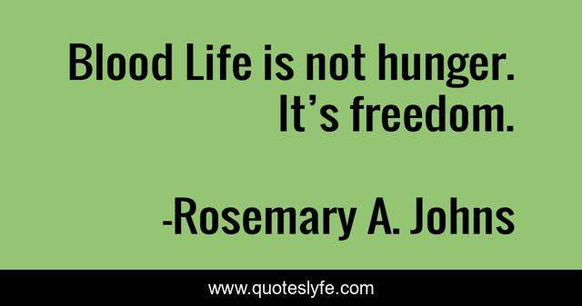 This page presents the quote "Blood Life is not hunger. It’s freedom.". Author of this quote is Rosemary A. Johns. This quote is about fantasy-romance, fantasy-fiction, fantasy-series, vampire, fantasy-books, romance, fantasy, vampire-series, vampires-paranormal-romance,.