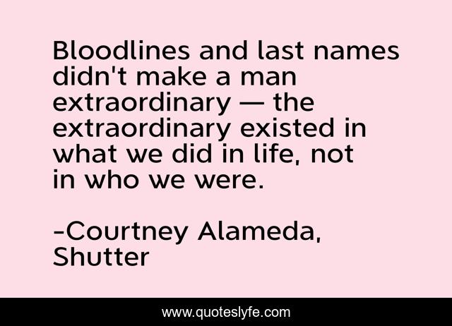 This page presents the quote "Bloodlines and last names didn't make a man extraordinary — the extraordinary existed in what we did in life, not in who we were.". Author of this quote is Courtney Alameda, Shutter. This quote is about life, family, bloodlines, extraordinary, legacy, heritage,.