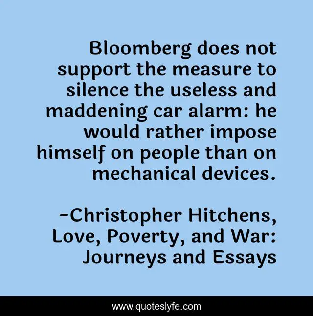 This page presents the quote "Bloomberg does not support the measure to silence the useless and maddening car alarm: he would rather impose himself on people than on mechanical devices.". Author of this quote is Christopher Hitchens, Love, Poverty, and War: Journeys and Essays. This quote is about tyranny, michael-bloomberg, cars, pettiness, car-alarms, mayoralty-of-michael-bloomberg, 2004, big-government, law,.