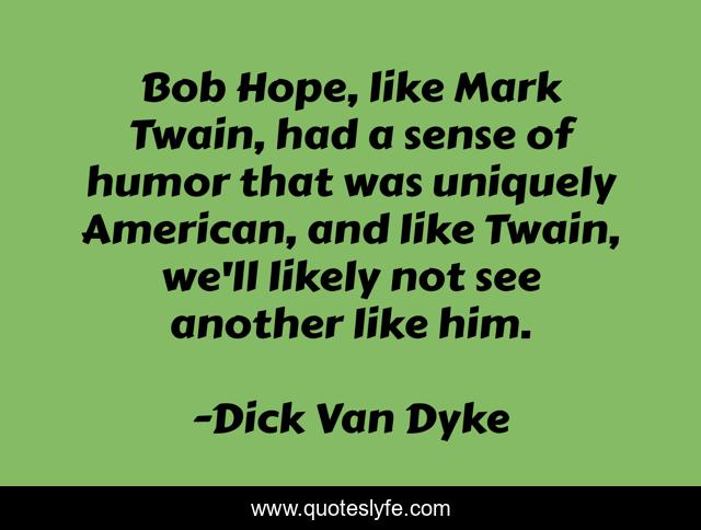This page presents the quote "Bob Hope, like Mark Twain, had a sense of humor that was uniquely American, and like Twain, we'll likely not see another like him.". Author of this quote is Dick Van Dyke. This quote is about american, hope,.