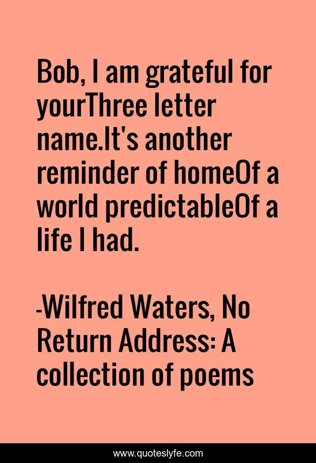 This page presents the quote "Bob, I am grateful for yourThree letter name.It's another reminder of homeOf a world predictableOf a life I had.". Author of this quote is Wilfred Waters, No Return Address: A collection of poems. This quote is about epistolary, literature, migration, migrant,.